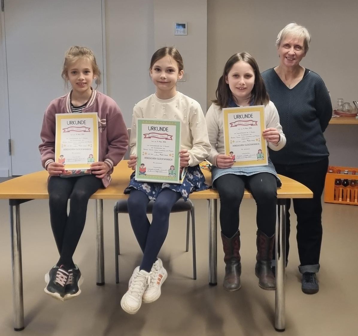 Gleichwohl wollten auch alle den begehrten Wanderpokal in ihre Klasse holen, den es für die meisten Stempel auf den Stempelkarten gab. Dabei hat sich die 4d besonders motiviert gezeigt, ihren Pokal aus dem letzten Jahr zu verteidigen. Mit beeindruckenden 213 Stempeln bei 25 Schülerinnen und Schülern ging der Pokal wieder an die 4d und wurde von Frau Lenz an die Klassensprecher überreicht.